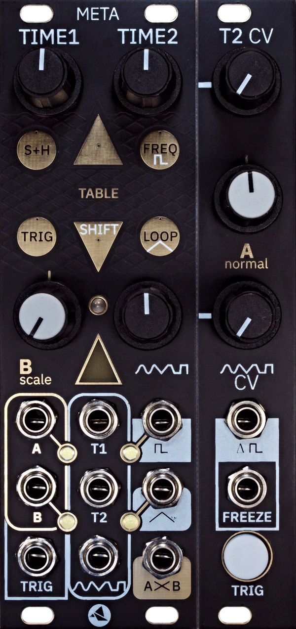 META crossfades between two inputs with a general purpose contour generator. It is a flexible tool for creating signals or routing and shaping other sources.
