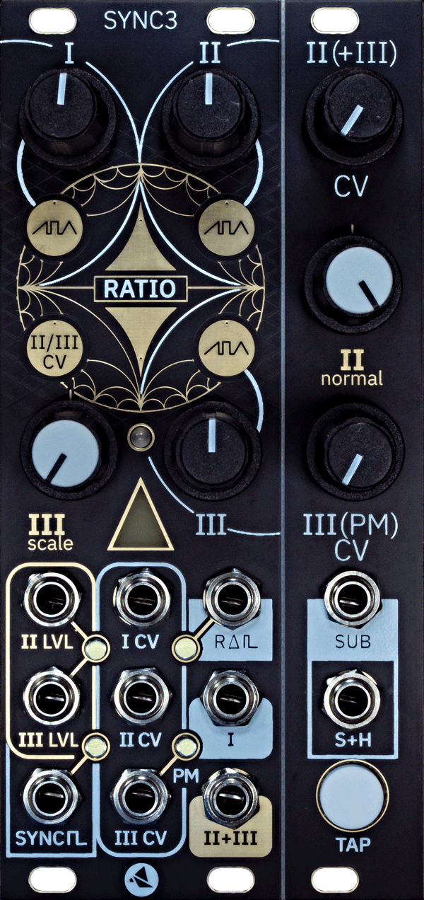 SYNC3 is a trio of oscillators that track the frequency and lock to the phase of a master input clock. Each has an independently selectable waveshape and clock multiplication/division factor, or "ratio".